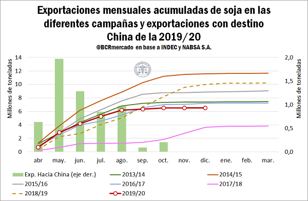 Analizando las exportaciones de soja para la corriente campaña, resulta llamativo que la exportación de estimada para este ciclo (6,8 Mt) se ubique un 34% por debajo de los envíos al exterior en la campaña anterior (10,2 Mt), considerando que la baja en la producción es sólo del 10%. En particular cuando se considera que en el mercado global, la demanda de la oleaginosa se ha mantenido sólida a lo largo del año, con China como principal comprador.
