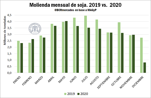 En tanto, la molienda de soja en Argentina continúa aletargada. La readecuación del esquema de derechos de exportaciones en favor del incentivo al procesamiento interno de la oleaginosa y el agregado de valor había comenzado a surgir efecto y en el mes de noviembre, por única vez en el año, el crushing superó el volumen del mismo mes del año anterior. Sin embargo, las interrupciones en la logística de descarga en plantas del mes de diciembre volvió a hundir el nivel de actividad y sólo se procesaron 808.184 toneladas, un 70% por menos que en diciembre de 2019. De esta manera, el 2020 cierra con un total procesado de 36 Mt, marcando una caída del 12,5% respecto del año anterior.