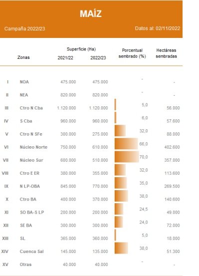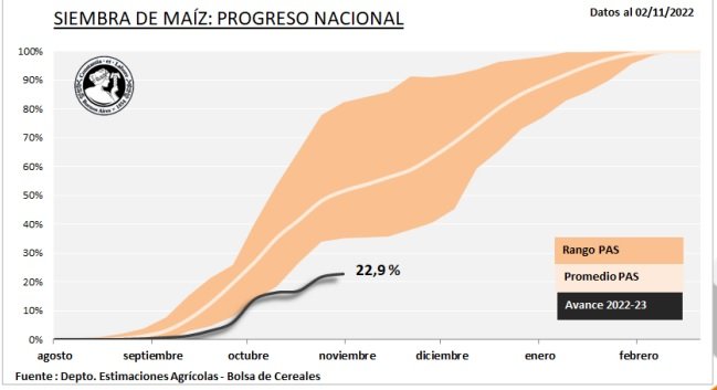 Durante la última semana, la incorporación de cuadros de maíz con destino grano comercial continuó en el centro y sur del área agrícola nacional. Luego de relevar un progreso intersemanal en las labores de apenas 1,1 puntos porcentuales, el avance de siembra ya se ubica en 22,9 % de nuestra actual proyección de siembra para la campaña 2022/23 de 7.300.000 Ha. Esta superficie representa en números absolutos, 400.000 Ha menos que las implantadas la campaña previa (Campaña 2021/22: 7.700.000 MHa). El 62 % de los lotes ya implantados presenta una condición de cultivo entre normal y buena.