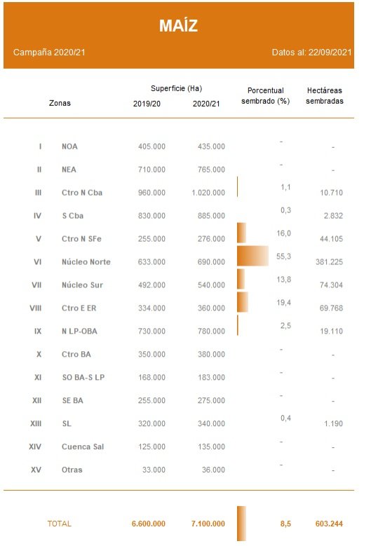 Desde nuestro informe previo, la siembra de maíz con destino grano comercial avanzó a buen ritmo. Los mayores progresos se relevaron en las provincias de Santa Fe y Entre Ríos, en lotes con buenos niveles de humedad. El avance nacional de siembra se ubica en el 8,5 % del área proyectada en 7.100.000 Ha. En números absolutos, esta superficie representa una expansión de 500.000 Ha en comparación al ciclo previo (Campaña 2020/21: 6,6 MHa). A la fecha, las labores muestran una demora interanual de 2,5 puntos porcentuales.