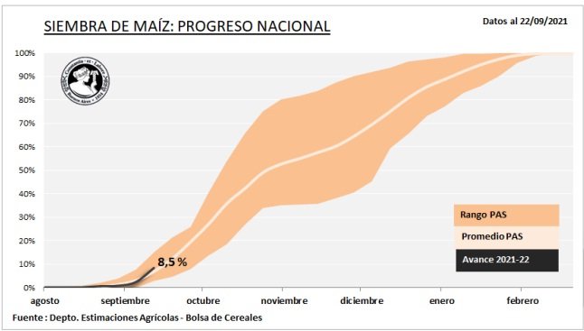 La siembra del cereal cubre el 8,5 % de la actual proyección de 7,1 MHa para el ciclo 2021/22, que representa un incremento de área interanual de 7,6 %. Los avances registran una demora entre campañas de solo 2,5 pp.