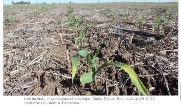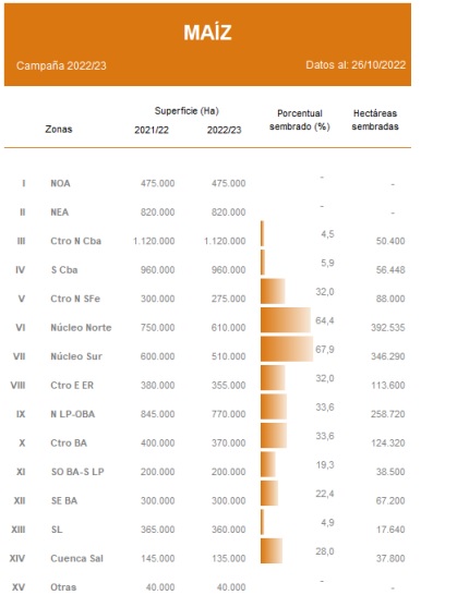 Los días previos al presente informe, se registró una mejora en la humedad de los perfiles en parte de los cuadros sembrados de maíz con destino grano comercial en el centro y sur del área agrícola. A la fecha, el 58 % de los lotes presenta una condición hídrica entre óptima y adecuada. Por otro lado, luego de registrar un progreso intersemanal en las labores de 4,8 puntos porcentuales, el avance de siembra ya se ubica en 21,8 % de nuestra proyección de siembra para la campaña 2022/23 de 7.300.000 Ha. Esta superficie representa en números absolutos, 400.000 Ha menos que las implantadas la campaña previa (Campaña 2021/22: 7,7 MHa)