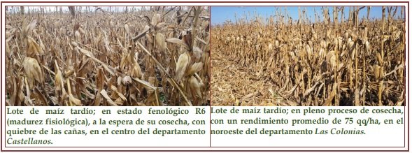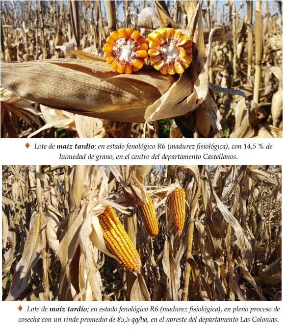 Las estables condiciones climáticas, con ambientes secos favorecieron un mayor ritmo del proceso de cosecha del maíz tardío, en los departamentos del centro del SEA, observándose un movimiento sostenido de equipos, cosechadoras y camiones, que marcaron la plena actividad desarrollada. Hasta la fecha, la recolección se concretó en un 92 % del total sembrado, un adelanto de 7 puntos semanales y un retraso de 2 interanuales, comparado con similar lapso, de la campaña 2020. Los rendimientos promedios registraron estabilidad, con pequeñas variaciones alcistas y oscilaron entre mínimos de 58 a 65 qq /ha y máximos de 87 a 95 qq/ha, con lotes puntuales de 100 -105 – 110 qq/ha. En lo avanzado de la trilla y en los resultados obtenidos, los maizales demostraron y consolidaron todo su potencial genético como consecuencia de las óptimas condiciones meteorológicas, acontecidas desde el inicio del ciclo. No se encontraron inconvenientes sanitarios por enfermedades, pero continuó observándose la caída de plantas, por el quiebre de las cañas. Se detectó, el siguiente estado fenológico: R “estados reproductivos”, R6 (madurez fisiológica)
