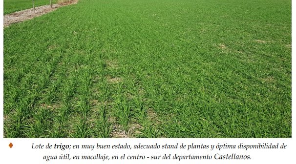 En una superficie implantada de 376.000 ha, en el área del SEA, el cultivo de trigo evidenció un 98 % estado bueno a muy bueno, con lotes excelentes y un 2 % bueno a regular. La sanidad de los sembradíos no registró inconvenientes de importancia hasta la fecha, solo en algunas parcelas puntuales con variedades susceptibles, se observó presencia de roya de la hoja o anaranjada (Puccinia recondita).