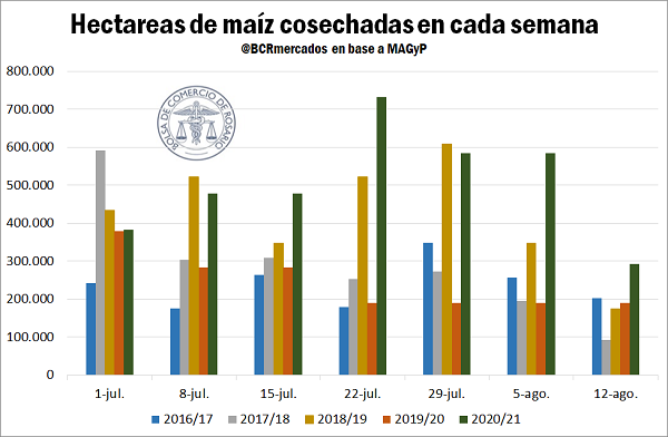 La cosecha de maíz avanzó fuertemente en el último mes y se encuentra virtualmente finalizada, sólo restando por recolectarse el 2% del área a nivel nacional. Tal como se comentó en ediciones anteriores, en la actual campaña una gran proporción del área total fue implantada con maíces de segmento tardío. Esto ha dejado como consecuencia que una elevada cantidad de hectáreas se cosechara entre principios de julio y principios de agosto. En el siguiente gráfico se observan las hectáreas cosechadas semanalmente en los meses de julio y agosto en las últimas cinco campañas. Tal como se puede apreciar, el número de hectáreas semanales recolectadas desde principios de julio del 2021 ha sido elevado, erigiéndose por encima del registro de los años anteriores en varias semanas, particularmente desde mediados del mes a la fecha. Además, en ese período se cosecharon 3,5 millones de hectáreas en total, un 39% del área total.