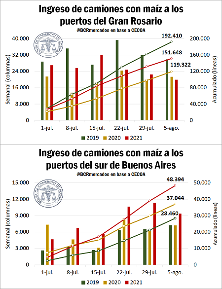 Esta elevada superficie de maíz recolectada en el último mes ha conducido a un marcado incremento en el número de camiones ingresados a los puertos del país. De hecho, desde inicios de julio del corriente año a la fecha, ingresaron a los puertos del Gran Rosario 151.648 camiones, lo cual marca una suba del 27% respecto de igual período del 2020, mientras que a los puertos del sur de la provincia de Buenos Aires arribaron 48.394 unidades, 31% más que el año previo.