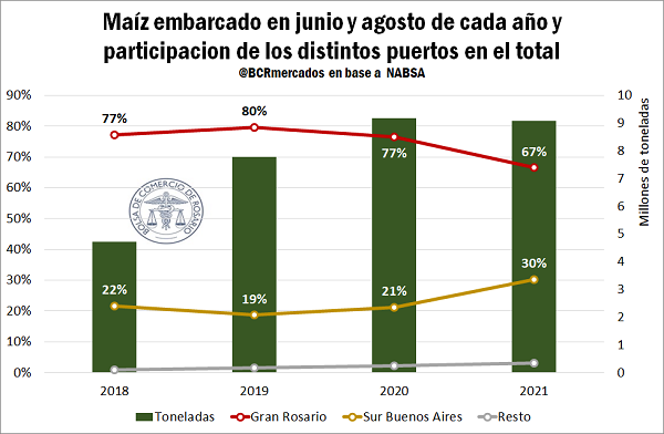 Asimismo, este incremento en el arribo de camiones con maíz a los puertos del sur bonaerense también condice con los números de embarques. En los meses de julio y agosto del corriente año, el total de toneladas de maíz embarcadas y programadas a embarcar desde puertos argentinos asciende a 9,1 Mt, de las cuales el 67% tienen como origen los puertos del Gran Rosario, mientras que el 30% los puertos de Bahía Blanca y Necochea/Quequén. Esta es la menor importancia relativa de los puertos del Up-River (y, paralelamente, la más elevada proporción de los del sur de Buenos Aires) desde al menos el año 2018.