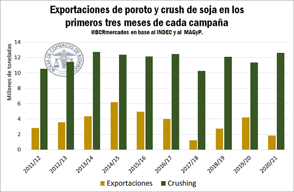 En cuanto a la soja, existen dos fenómenos interesantes de analizar que están relacionados entre sí. Por un lado, las exportaciones de poroto de soja en los primeros tres meses de la campaña alcanzan 1,8 Mt, es decir, 56% menos que en el primer trimestre del ciclo previo. Además, es el segundo volumen más bajo de la última década, sólo superado por lo ocurrido en el ciclo 2017/18, el de la fatídica sequía histórica que afectó severamente la producción. Por el otro, el crush de soja en los primeros 3 meses de la 2020/21 totaliza 12,6 Mt, 10% más que en los primeros tres meses de la campaña anterior y registrando el segundo mejor guarismo de la última década.