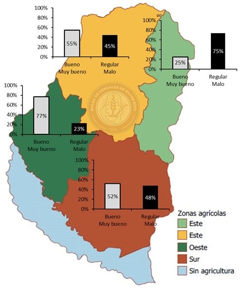 El análisis territorial muestra diferencias marcadas. El oeste entrerriano se posiciona como la zona con mejores perspectivas, con un 77% del área en condiciones entre buenas y muy buenas.