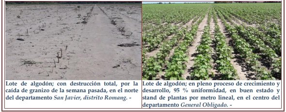Zona este: cultivo en que su estado se observó en dos situaciones: los lotes sembrados tempranos, presentaron un muy buen estado, con un stand de plantas adecuado, sin inconvenientes hasta el momento y los lotes sembrados más tarde, afectados por los excesos de precipitaciones el stand de plantas logrado no sería el adecuado en muchos casos, generando lotes no uniformes y espacios para el desarrollo de malezas. Los cultivares implantados con anterioridad, continuaron su ciclo normalmente en crecimiento y desarrollo de las plantas, presentando buen estado, con humedad adecuada en el perfil del suelo y con temperaturas normales para la época. Continuó el monitoreo de las trampas para la detección de la presencia de picudos en los predios o cercanía de los mismos, realizándose aplicaciones, en caso de necesidad. En los lotes donde el cultivo comenzó la floración, las trampas no serían efectivas para la atracción de los picudos, que serían atraídos por las mismas flores, monitoreándose posibles ataques en los pimpollos y evaluándose los daños. Zona oeste: el proceso de siembra quedó interrumpido por las precipitaciones, luego, con el cambio de las condiciones climáticas se realizaron algunas siembras, en lugares puntuales. Dadas las situaciones ambientales enunciadas en los informes y la próxima finalización del período de siembra establecido por el SENASA, se estaría ante la posibilidad de que no se alcance en el área la cantidad de ha previstas en la intención de siembra (42.750 ha). Situación que se seguiría monitoreando y relevando. Se observaron los siguientes estados fenológicos: V “estados vegetativos” V1 (siembra a emergencia), V2 (emergencia), V3 (tercera hoja verdadera desplegada), V5 (quinta hoja verdadera despegada), V6 (sexta hoja verdadera despegada), V8 (octava hoja verdadera despegada), R “estados reproductivos” R1 (aparición del primer pimpollo). – y en lotes más avanzados