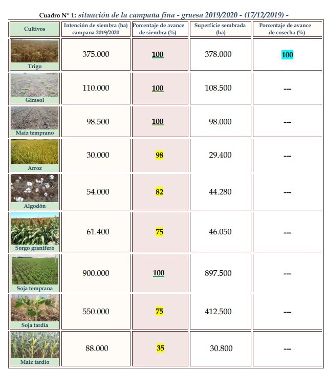 El proceso de siembra presentó un grado de avance del 75 %, aproximadamente unas 412.500 ha de las 550.000 ha previstas inicialmente, con un retraso de 7 puntos, en comparación con similar período, de la campaña pasada. La implantación se interrumpió nuevamente en la semana, por el evento mencionado en un principio, el que generó ciertos problemas en los lotes sembrados con sectores deprimidos y bajos, con consecuencias en la germinación – emergencia, así como también mortandad de plántulas y plantas. Continuaron las aplicaciones de herbicidas pre-emergentes, para un buen control de malezas. Se observaron, los siguientes estados fenológicos: V “estados vegetativos”, VE (emergencia), Vc (estado de cotiledón, hojas unifoliadas pegadas), V1 (1º nudo), V2 (2º nudo), V3 (3º nudo) y en lotes más avanzados, puntuales en V4 (4º nudo).