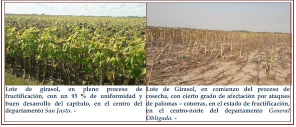 Continuaron observándose los ataques de palomas y cotorras, ya enunciados, situación que llevó a que algunos productores iniciaran el proceso de cosecha un par de días antes, evitando así, pérdidas mayores en los rendimientos. Por lo cual, en la semana, comenzó la trilla del cultivo con alguna referencia, de que los primeros rendimientos fueron buenos, generando ciertas expectativas. Un 93 % del cultivo implantado se encontró en estado bueno a muy bueno, con algunos lotes excelentes, un 5 % en estado bueno a levemente regular y un 2 % en estado regular a malo. Se encontraron los cultivares en muy buen estado sanitario, no presentándose inconvenientes de patógenos ni de insectos. Se observaron los siguientes estados fenológicos: R “estados reproductivos”, R2 (distancia de menos de 2 cm entre la inserción del botón floral y la última hoja), R3 (distancia de más de 2 cm entre la inserción del botón floral y la última hoja), R5 “antesis” R5 – 1 (inicio de antesis), R5 – 5 (mitad de floración 50 %, el % dependiendo del área del capítulo cubierto por flores, cantidad de círculos), R6 (fin de floración, caídas de flores liguladas) en lotes más avanzados en R7 (la parte de atrás del capítulo comenzó a ponerse amarillento) y muy puntuales en comienzo de R9 “madurez fisiológica” (parte de atrás del capítulo y las brácteas de color amarillento a marrón oscuro)
