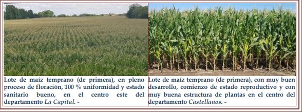 Un 98 % del cultivo se halló en estado bueno a muy bueno, con lotes excelentes y un 2 % en estado regular. Las nuevas precipitaciones registradas en la semana en toda el área, generaron condiciones óptimas a ideales para el cultivo, el cual se encontró en pleno desarrollo de “estados reproductivos”. Esta situación permitiría el cumplimiento de dichos estados sin inconvenientes, con perfiles de suelos cargados de agua y temperaturas acordes a la época del año, generando muy buenas perspectivas por los futuros rendimientos y la producción final. La sanidad detectada fue buena, sin manifestaciones de ataques de enfermadades ni de plagas. Se observaron los siguientes estados fenológicos: en un bajo porcentaje en V “estados vegetativos”, V10 (10º hoja desarrollada), Vt (panojamiento) y en un alto porcentaje en R “estados reproductivos”, R1 (emergencia de estigma), R2 (cuaje – ampolla), R3 (grano lechoso) y lotes puntuales más avanzados en R4 (grano pastoso).