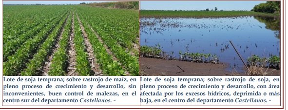 Los cultivares continuaron su crecimiento y desarrollo foliar, sin problemas, observándose en general, estado bueno a muy bueno y con condición sanitaria buena. La aplicación de herbicidas para el control de malezas, no ha disminuido, se siguió con dicha tarea, sin pérdida de tiempo y poder de ataque, ante las condiciones ambientales que reinaron favoreciendo el crecimiento y desarrollo de las mismas. Por otro lado, las nuevas precipitaciones enunciadas y ante suelos saturado – sobresaturados y en áreas topográficamente más deprimidas, se observó un incremento de superficie con encharcamiento – anegamientos, con consecuencias en los cultivares como por ejemplo, muerte de plantas y pérdidas de superficie implantada. Se observaron, los siguientes estados fenológicos: V “estados vegetativos”, VE (emergencia), Vc (estado de cotiledón, hojas unifoliadas pegadas), V1 (1º nudo), V2 (2º nudo), V3 (3º nudo), V4 (4º nudo), V5 (5º nudo), V6 (6º nudo), V7 (7º nudo) y en lotes más avanzados en V8 (8º nudo).