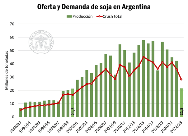 Parte de la materia prima a las fábricas será provista por soja proveniente de vecinos países. Las importaciones totales para el ciclo 2022/23 (abr-mar) se estiman en 10,7 millones de toneladas, un récord histórico para Argentina. Incluso así, como se ha manifestado, la capacidad ociosa de las plantas rondará el 70%.