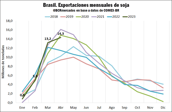 Se espera que mayo también sea un mes de altos volúmenes de exportación y ello mantendrá la presión bajista del mercado. En la última semana la ANEC publicó una proyección de embarques para el presente mes de 15,3 Mt, lo cual sería nuevamente un récord y levemente por encima de 2021.