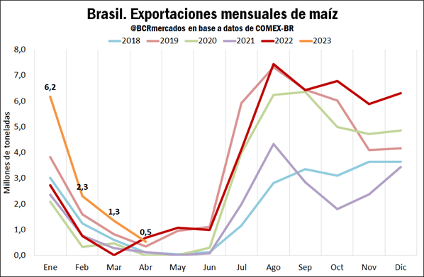 El punto clave a remarcar es que, Brasil exportó volúmenes muy importantes de maíz hacia China desde finales del año pasado y esto permitió al país asiático abastecerse de stocks de grano desde Sudamérica. En abril, las exportaciones brasileñas de maíz se ubicaron en 536.000 toneladas, por debajo de igual período del año previo. No obstante, se venía de 6 meses de un gran volumen de exportaciones de maíz, al tiempo que China se está adelantando y apresuradamente cambiando su foco para comprar el maíz de segunda de Brasil en vez de cereal estadounidense.