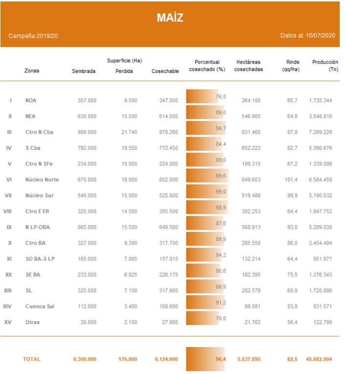 Durante la última semana, la recolección de maíz con destino grano comercial alcanzó el 90,4 % del área apta. El progreso intersemanal fue de 4 pp., en números absolutos unas 236.000 Ha. Se mantiene un adelanto en las labores en comparación a la campaña previa de 29,4 puntos porcentuales. Gran parte de los avances se relevaron en las provincias de Buenos Aires, Córdoba y Chaco. El rinde medio nacional a la fecha se ubica en 82,5 qq/Ha. Bajo este escenario, se mantiene la proyección de producción de 50 MTn.