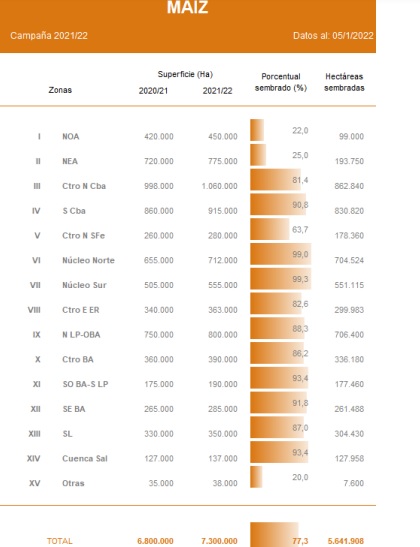 Desde nuestro informe previo la siembra de planteos de maíz se concentró en el oeste y norte del área agrícola nacional. Las lluvias heterogéneas que se registraron durante las últimas semanas, permiten continuar de manera parcial con el avance de las máquinas. Luego de relevar un progreso intersemanal en las labores de 6,6 puntos porcentuales, el avance de siembra registrado se ubica en el 77,3 % de nuestra actual proyección de 7.300.000 Ha para la campaña 2021/22 (500.000 Ha más que las sembradas el ciclo previo). A la fecha, la demora interanual en las labores ya se ubica en 8 pp. En números absolutos, se incorporaron más de 5,6 MHa