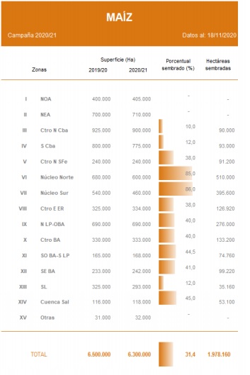 Durante la última semana, la incorporación de lotes de maíz con destino grano comercial continuó a ritmo lento en el país. Gran parte de los cuadros sembrados se ubicaron en el sur de la provincia de Buenos Aires. A la fecha ya se logró incorporar el 31,4 % de nuestra proyección para la campaña 2020/21 de 6.300.000 Ha. Esta superficie representa en números absolutos, 200.000 Ha menos que las implantadas la campaña previa (Campaña 2019/20: 6,5 MHa). Luego de registrar, un avance intersemanal de 0,2 puntos porcentuales, la demora interanual en las labores se eleva hasta los 14,3 pp.