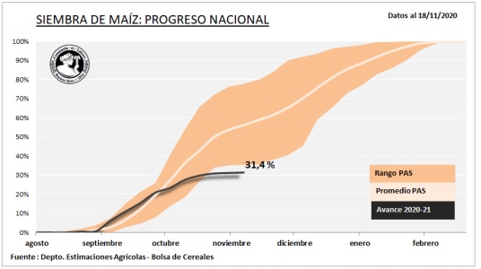 La siembra cubre el 31,4 % de la actual proyección de 6,3 MHa para el ciclo 2020/21. El avance intersemanal fue de 0,2 pp y mantiene una demora de 14,3 pp en comparación a la campaña previa.