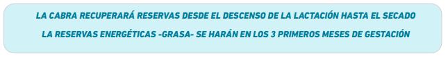 alimentos no alcanza para satisfacer la demanda, por lo que la cabra hace uso de las reservas, descendiendo de peso.Por esto, se debe prestar atención a su recuperación y salud. La ración, en cada etapa, debe adecuarse al forraje disponible y los requerimientos del animal, permitiendo expresar su máxima producción a los 21 días de la parición y luego empezar a disminuir.
