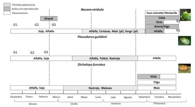 Para comprender la colonización de un lote o cultivo determinado es necesario no solo conocer la biología de estas especies sino también el paisaje que lo rodea y las condiciones ambientales que favorezcan su supervivencia y reproducción posterior. En la Figura 1 se detallan los lugares de refugios y posibles generaciones de diferentes especies de chinches para la región centro del país. Mediciones realizadas en la EEA INTA Marcos Juárez determinaron que cultivos como vicia son preferidos para la realización de la generación post-invernal y por lo tanto aumentan sus poblaciones sobre dicho cultivo actuando como cultivo trampa pero que fueron controladas por la acción mecánica de rolo produciendo altos niveles de mortalidad. Para especies como la “chinche de la alfalfa” Piezodorus guildini la producción de pastura de base alfalfa pueden favorecer sus poblaciones y de allí dispersarse a cultivos cercanos.