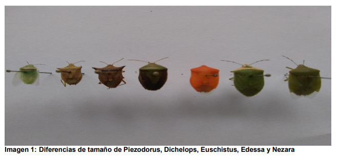 Por otro lado, realizando comparación de la efectividad de diferentes principios activos en diferentes especies de chinches a nivel de laboratorio (datos no publicados) indican que no existirían diferencias en las DL 50 entre poblaciones de Nezara y Piezodorus a nivel local, pero si con Euschistus heros en los cuales se observa una mayor tolerancia a los insecticidas. Esto no quiere decir que en poblaciones de diferentes zonas sometidas a distintos principios activos esta relación se mantenga o cambie. Teniendo en cuenta lo escrito con anterioridad un aspecto no desarrollado es el posible efecto del tamaño de los insectos en relación a la posible cantidad de impactos en la aplicación ya que, si a nivel de laboratorio no existen diferencias entre algunas especies, el comportamiento a campo de los insecticidas podría estar influido por este parámetro. Mediciones llevadas en laboratorio indican que como valores promedio de macho y hembra Nezara en sus subespecies y Edessa meditabunda miden 123 mm2 y para Euschistus heros, Dichelops furcatus y Piezodorus guildini los valores son de 99, 86 y 66 mm2 respectivamente. (Imagen 1). Bajo un simple análisis para insecticidas de contacto la chinche de la alfalfa necesitaría recibir el doble de impactos de un mismo insecticida para igualar la dosis de insecticida que la chinche verde, en otras palabras esta especie “Piezodurus” recibiendo la mitad de impactos en su superficie debería ser suficiente para ser letal.