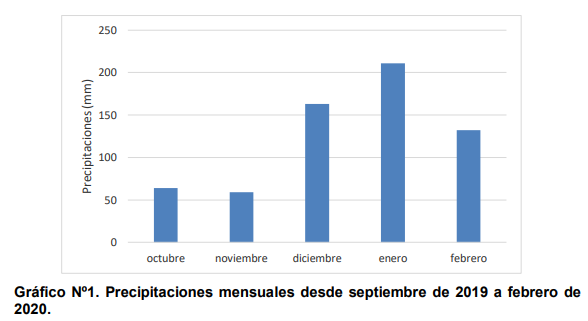 Durante el ciclo de desarrollo del cultivo, desde septiembre a febrero, las precipitaciones acumuladas alcanzaron los 637 mm (Gráfico 1), siendo durante los meses de diciembre, enero y febrero superiores a las medias históricas.