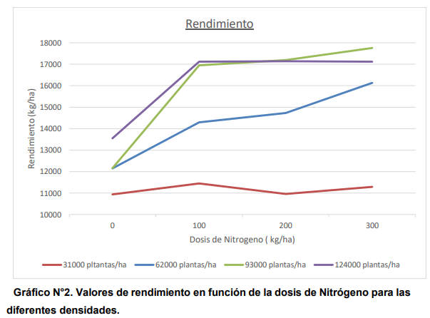 El rendimiento promedio del ensayo fue de 14.434 kg/ha, con extremos de 17.760 y 10.936 kg/ha. El menor rendimiento corresponde al tratamiento de 0 de Nitrógeno y la menor densidad correspondiente a 31.000 plantas/ha. La combinación de 93.000 pl/ha y 300 kg/ha de Nitrógeno arrojó el mayor valor de rendimiento.