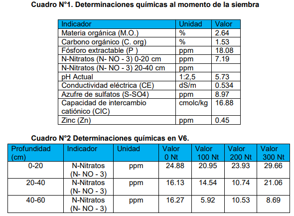 En el cuadro N°1 se muestran los valores de las determinaciones químicas se realizaron al momento de la siembra y en el Cuadro N°2 previo a la fertilización nitrogenada en V6.