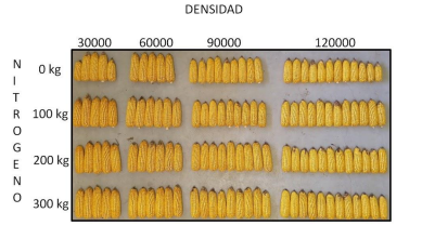 - La combinación de densidad y dosis de nitrógeno óptima que logró expresar sus máximos rendimiento correspondió a 93.000 plantas/ha y 300 kg/ha de Nitrógeno.