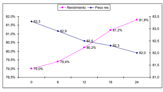 Rendimiento de la tropa (RT) = 11.750,67 PCT/14.418 kg PVTx100 = 81,50 %