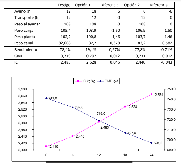 Otra consecuencia del ayuno es que a mayor duración del ayuno en granja, menos peso de salida para un mismo consumo de alimento y más tiempo de estancia en granja y en consecuencia, peor Índice de Conversión (IC) y Ganancia Media Diaria (GMD), como podemos ver también en la siguiente tabla.
