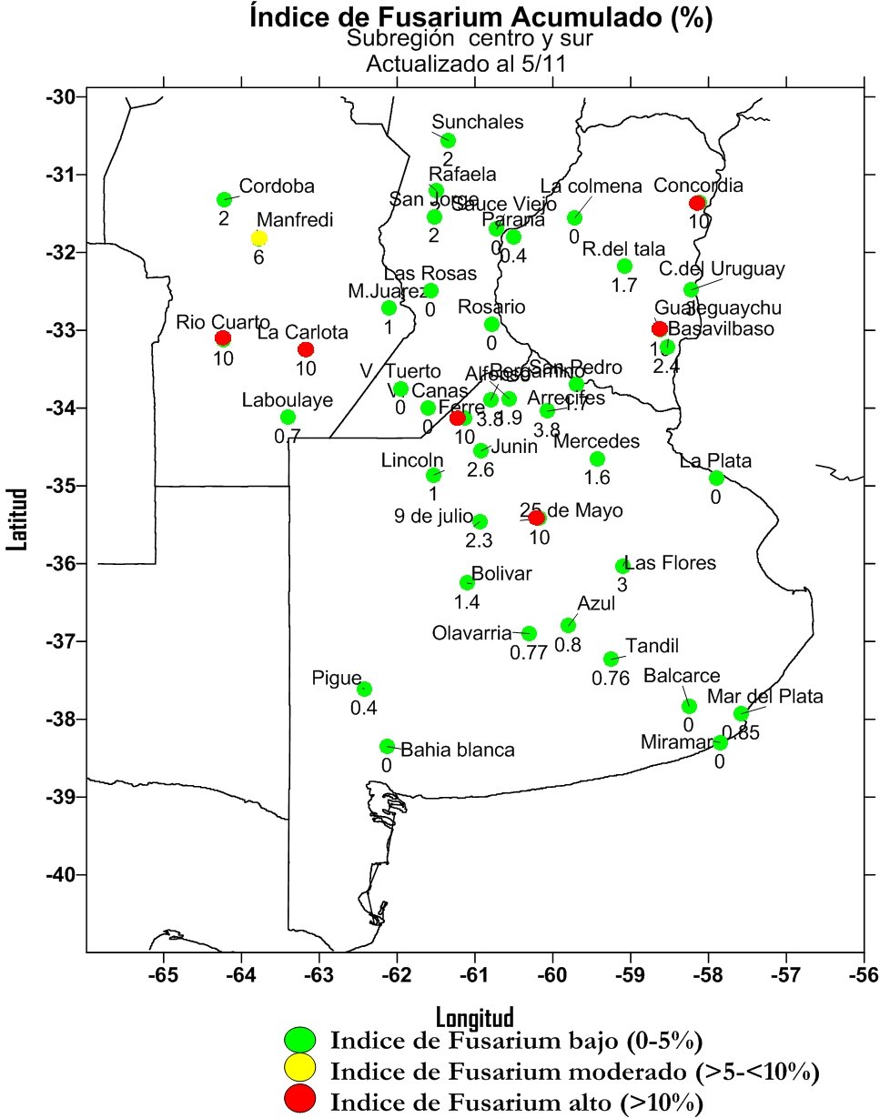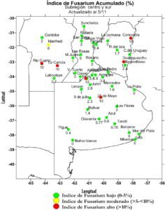 No hay cambios en el Índice de Fusarium debido a la ausencia de lluvias o a que las mismas fueron acompañadas de baja humedad relativa. Para seguir la evolución del Índice de Fusarium de un sitio específico se recomienda entrar al sitio web e indicar la fecha de aparición de las primeras espigas con anteras expuestas. Plataforma web