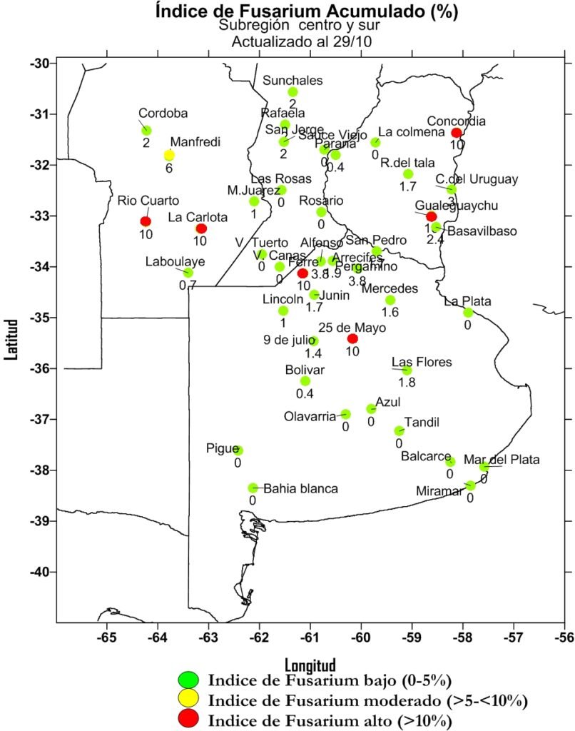 No hay cambios en el Índice de Fusarium debido a la falta de lluvias o a que las mismas fueron acompañadas por baja humedad relativa. Para seguir la evolución del Índice de Fusarium de un sitio específico se recomienda entrar al sitio web e indicar la fecha de aparición de las primeras espigas con anteras expuestas. Plataforma web