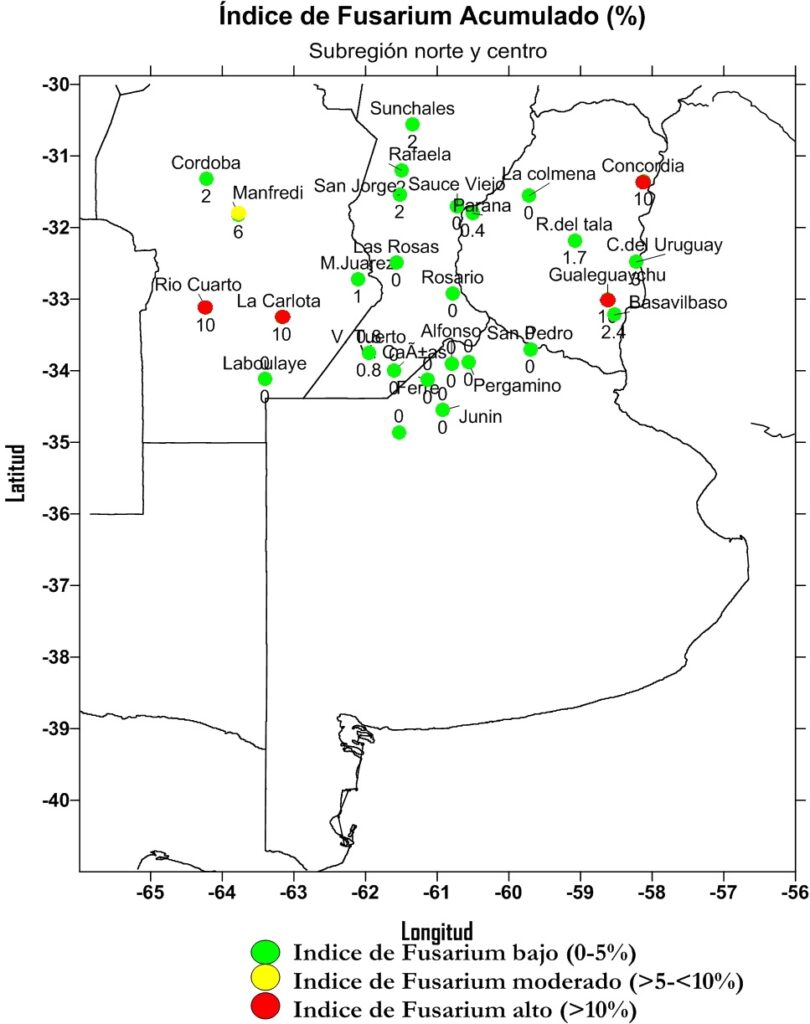 A la fecha no se han observado eventos infectivos de importancia. En el día de hoy se están registrando lluvias en toda la zona que dependiendo de la humedad relativa y temperatura acompañantes pueden provocar incrementos en el Índice de Fusarium. Para seguir la evolución del Índice de Fusarium de un sitio específico se recomienda entrar al sitio web e indicar la fecha de aparición de las primeras espigas con anteras expuestas. Plataforma web