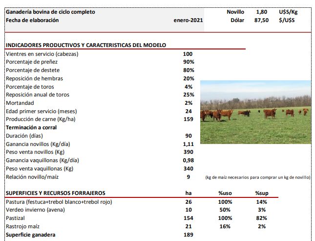 En este reporte se presenta el cálculo de costos, ingresos y resultados económicos para un sistema de producción bovina que incluye las actividades de cría y recría a campo y terminación en corral. El planteo definido corresponde a un nivel tecnológico medio para el norte de la provincia de Buenos Aires a enero de 2021.