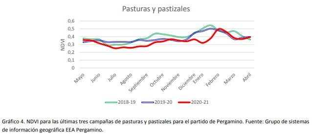 Al observar el índice de precipitaciones estandarizado1 para Pergamino (gráfico 3), podemos observar que durante todo el ciclo se transitó una sequía (teniendo en cuenta las precipitaciones acumuladas en los últimos 12 meses) la cual en algunos momentos llegó a niveles moderados a severos. Si analizamos las curvas de índice de vegetación de diferencia normalizada (NDVI)2 para las pasturas y pastizales en el partido de Pergamino (gráfico 4) para las últimas tres campañas, vemos que la última campaña muestra los valores más bajos evidenciando los efectos adversos que generó la situación de estrés hídrico en estos recursos forrajeros y por ende en el rendimiento en materia seca disponible para el ganado de los mismos.