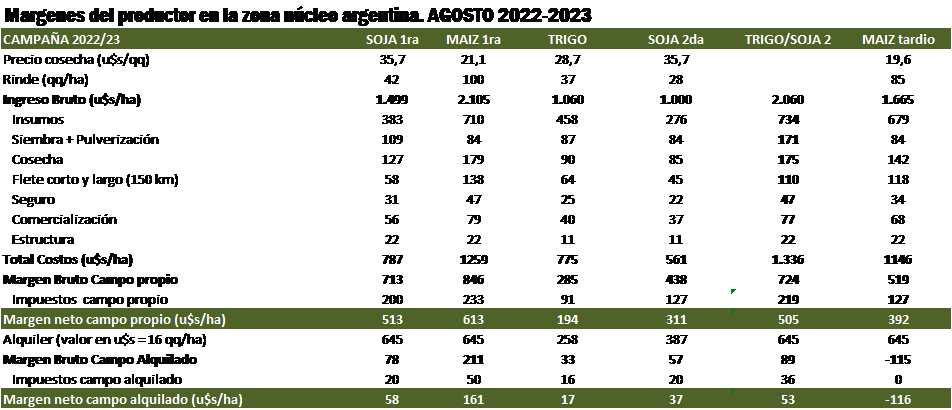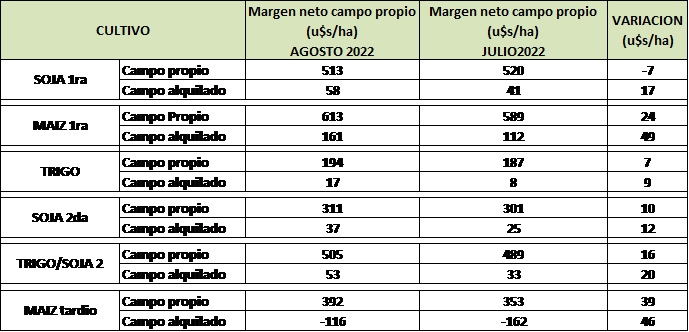 “El maíz sigue teniendo los mejores márgenes, pero la soja de primera, está por debajo aunque no tan lejos”, dicen desde Bigand, provincia de Santa Fe. La última actualización de los márgenes netos realizada el 2 de agosto indica que el maíz temprano permanece en el primer puesto de resultados. Tanto en campo propio como en arrendado, presentó los mejores números por hectárea, 613 u$s y 161 u$s respectivamente.