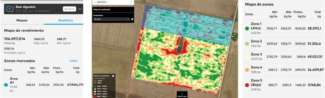 Es por esto que el principal beneficio de esta funcionalidad es el ahorro de tiempo ¿De qué manera? Gracias a la estandarización del procesamiento, se obtiene un mapa robusto sin necesidad de usar plataformas GIS – SMS. No solo eso sino que además, la plataforma entrega datos de rendimiento y superficie de cada zona para su análisis, permite la selección manual de zonas para hacer un análisis más profundo (siendo esto muy útil para las mediciones de ensayos en franjas apareadas o de anomalías en zonas especifica), permite comparar los mapas de cosecha con mapas de potenciales y otras capas de información; y por último, la información puede ser utilizada para prescripciones variables de siembra o nutrición y ambientaciones a futuro.