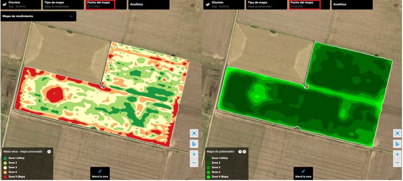 Un dato importante a considerar para quienes aún no tienen mapas de cosecha son los mapas de potencial de xarvio. Dichos mapas, son desarrollados por xarvio apenas el usuario dibuja el lote en la plataforma y lo que hacen es mostrar en una única capa la productividad histórica de cada sector del lote. Para ello se valen de imágenes satelitales históricas de hasta 10 – 15 años que muestran el desarrollo de los cultivos y su biomasa y los combinan para entender el potencial productivo de cada ambiente del lote “ajustan muy bien al resultado de rinde de un lote pudiendo ser utilizados en ambientaciones y prescripciones variables aun sin conocer su historial o tener mapas de cosecha de años anteriores”, añade Gastaldi.