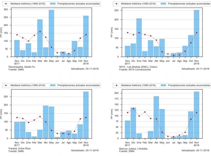 Pero más sorprendente aún es que ya hay zonas con más de 300 milímetros acumulados en noviembre. En Arroyo Cabral, por caso, el registro es de 307 milímetros. Cerca, en Ausonia, llegó a 292 milímetros; y en Villa María, a 287.