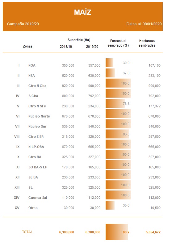 Mientras las reservas hídricas de los perfiles continúan recuperándose en buena parte del área agrícola, la siembra de maíz con destino grano comercial comienza a transitar su último mes. Las incorporaciones de lotes más importantes se relevaron en el norte del país, particularmente en la región del NEA. A la fecha el avance nacional se ubica en 88,2 % de las 6.300.000 Ha proyectadas para la campaña 2019/20. El avance intersemanal fue de 4,7 puntos porcentuales, en números absolutos cerca de 300.000 Ha. En paralelo los lotes tempranos transitan etapas reproductivas, ubicándose los cuadros más adelantados en la zona Centro-Norte de Santa Fe.