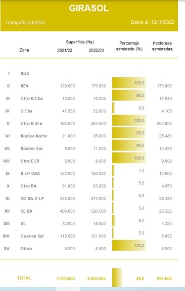 En números absolutos este progreso representa cerca de 600.000 hectáreas ya implantadas. La falta de precipitaciones en gran parte del área agrícola mantiene la demora interanual en las labores en 9,3 p.p. Junto con los retrasos en la siembra, el déficit hídrico genera que el 20,5 % del área implantada con la oleaginosa registre una condición de cultivo Regular/Mala