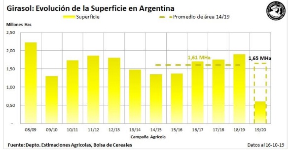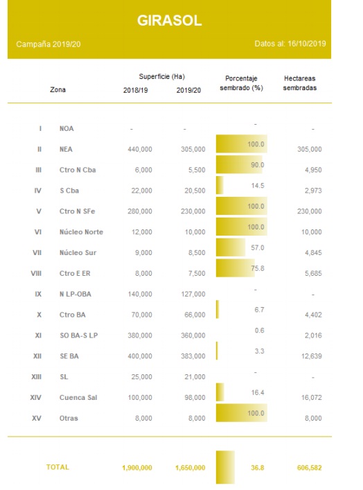 La siembra alcanzó el 36,8 % del área proyectada en 1,65 MHa para la campaña 2019/20. El progreso intersemanal ha sido de 1,7 puntos porcentuales, manteniendo una demora interanual en las labores de -11,1 puntos.