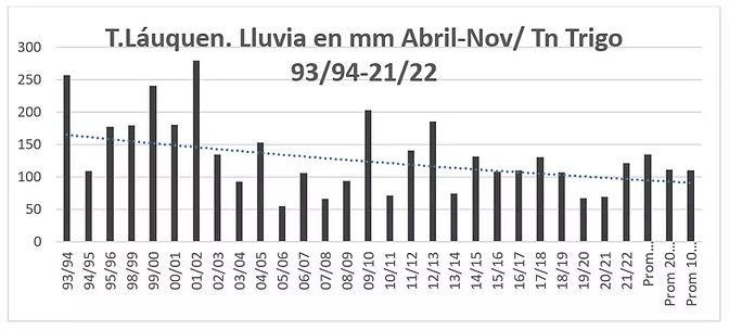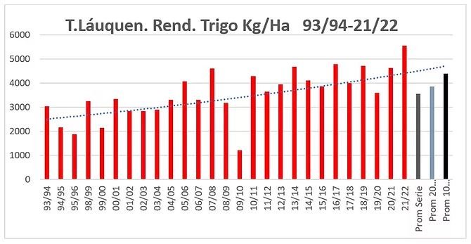 Los rendimientos de trigo promedio de los primeros y últimos tres años de la serie 93/94-21/22 pasaron de 2361 a 4596 Kg/ha (un incremento de un 95%) y mientras en el inicio del ciclo analizado se necesitaron 181 mm de agua de lluvia en el ciclo del cultivo, para producir una tonelada de trigo, el promedio de los últimos tres años fue de 86 mm por tonelada ) un 52,5% menos de agua en el ciclo.