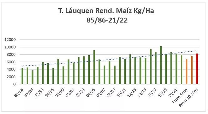 Para el caso del Maíz en el trienio inicial analizado 85/87 el rendimiento medio fue de 4190 Kg/Ha y se necesitaron para producir una tonelada de Maíz 276 mm de agua de lluvia en el ciclo del cultivo, mientras que en el último trienio 19/21 el rendimiento fue de 8265 kg/ha y fueron necesarios solo 81mm de agua de lluvia en el ciclo para producir una tonelada de grano, casi un 70% menos.