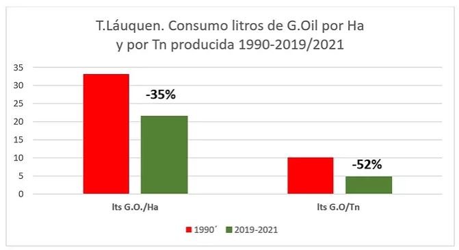 En el cultivo de Soja el promedio de rendimiento 1998/2000 fue de 2579 Kg/Ha y el logrado en 2019/2021 fue de 3389 Kg/Ha y en cuanto a la eficiencia de uso del agua los valores son 196 mm de lluvia en el ciclo del cultivo por tonelada producida mientras que en 98/2000 fueron necesarios 347 mm de lluvia en el ciclo por tonelada de soja producida.