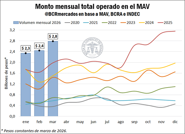 El punto más alto de actividad se registró en marzo, con operaciones por $2,8 billones. Si bien no superó el récord mensual absoluto (alcanzado en diciembre de 2025), consolidó la tendencia alcista que el mercado viene mostrando en los últimos años.